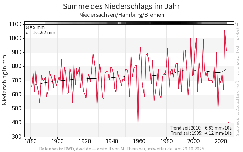 Moin Michael, auf mtwetter.de habe ich auch kein höheres Flächenmittel für NDS/HH/HB seit 1881 als dieses Jahr (aktuell 1.074mm) finden können. 1998, 2002 und 2007 lagen jeweils um die 1.000mm. Von daher nehme ich auch nicht an, dass an einer Bremer Station bislang mehr Niederschlag gemessen wurde. Und du hast Aufzeichnungen bis 1973?Kommentar: